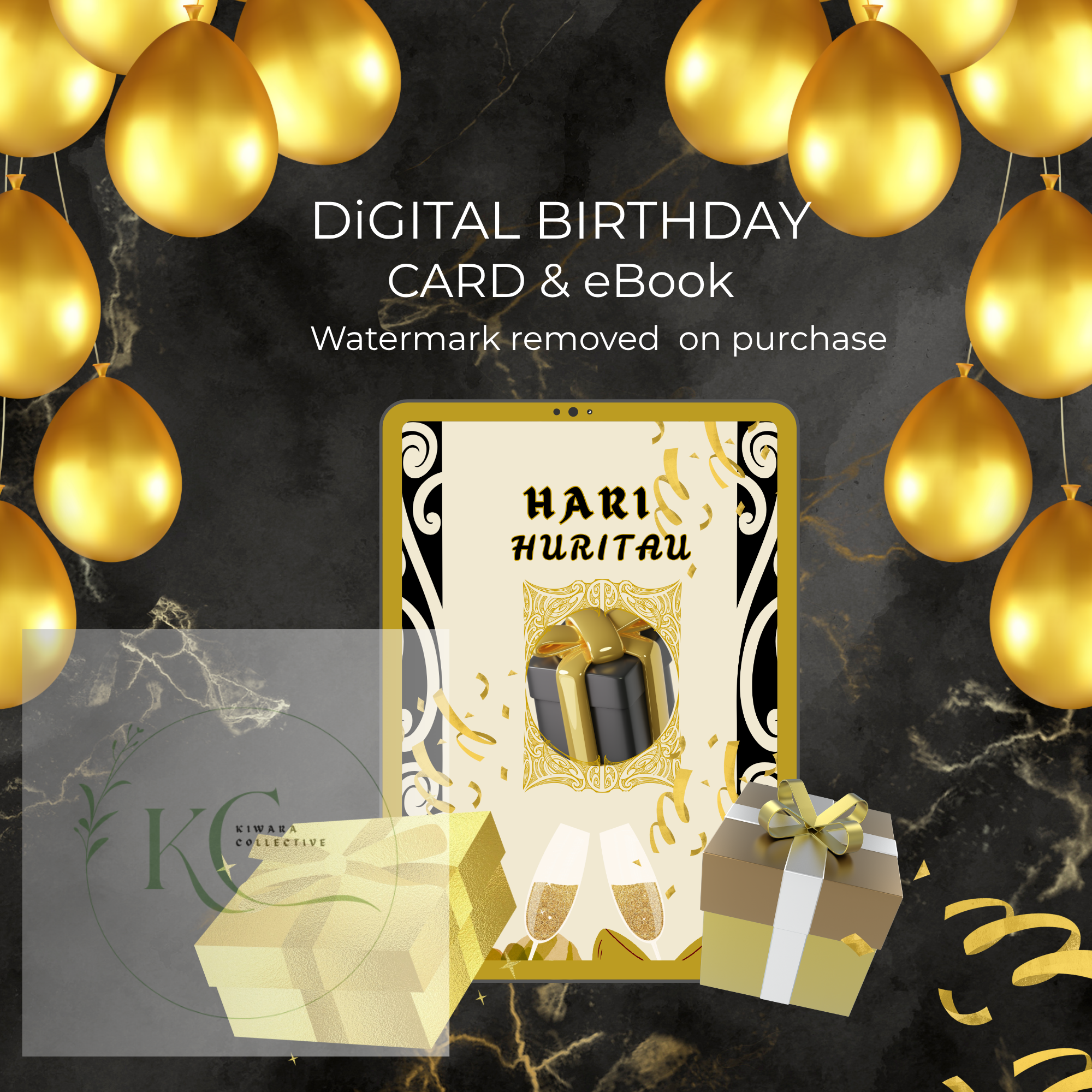 Bilingual Digital Birthday Card (Editable PDF + Bonus eBook) Black & Gold Theme
